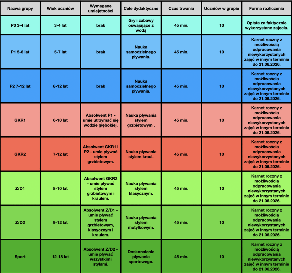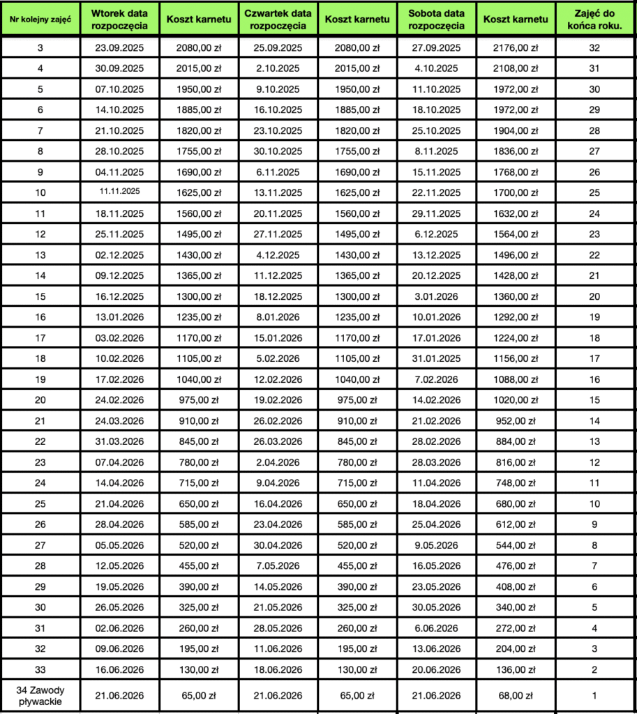 Poniżej plan zajęć, opis grup oraz kalendarz i ceny karnetów.